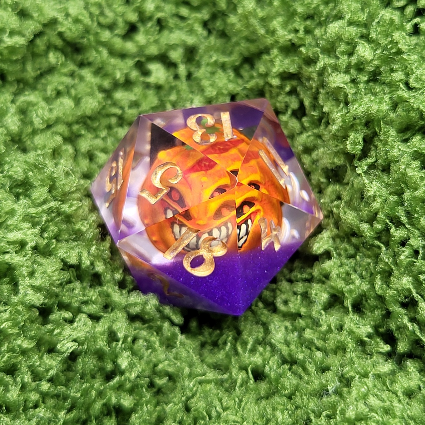 Sháníš jen jednu kostku? Vyber si přesně tu, kterou potřebuješ! Kusové kostky pro RPG, DnD, deskové hry nebo jako stylový doplněk do sbírky. Tato d20 má uvnitř ručně malovanou figurku prokleté Halloweenské dýně.
