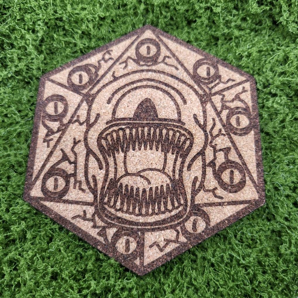 Korkový podtácek s vygravírovaným autorským motivem beholdera útočícího z dvacetistěnky, který by neměl chybět na stole žádného fanouška DnD a dračáků.