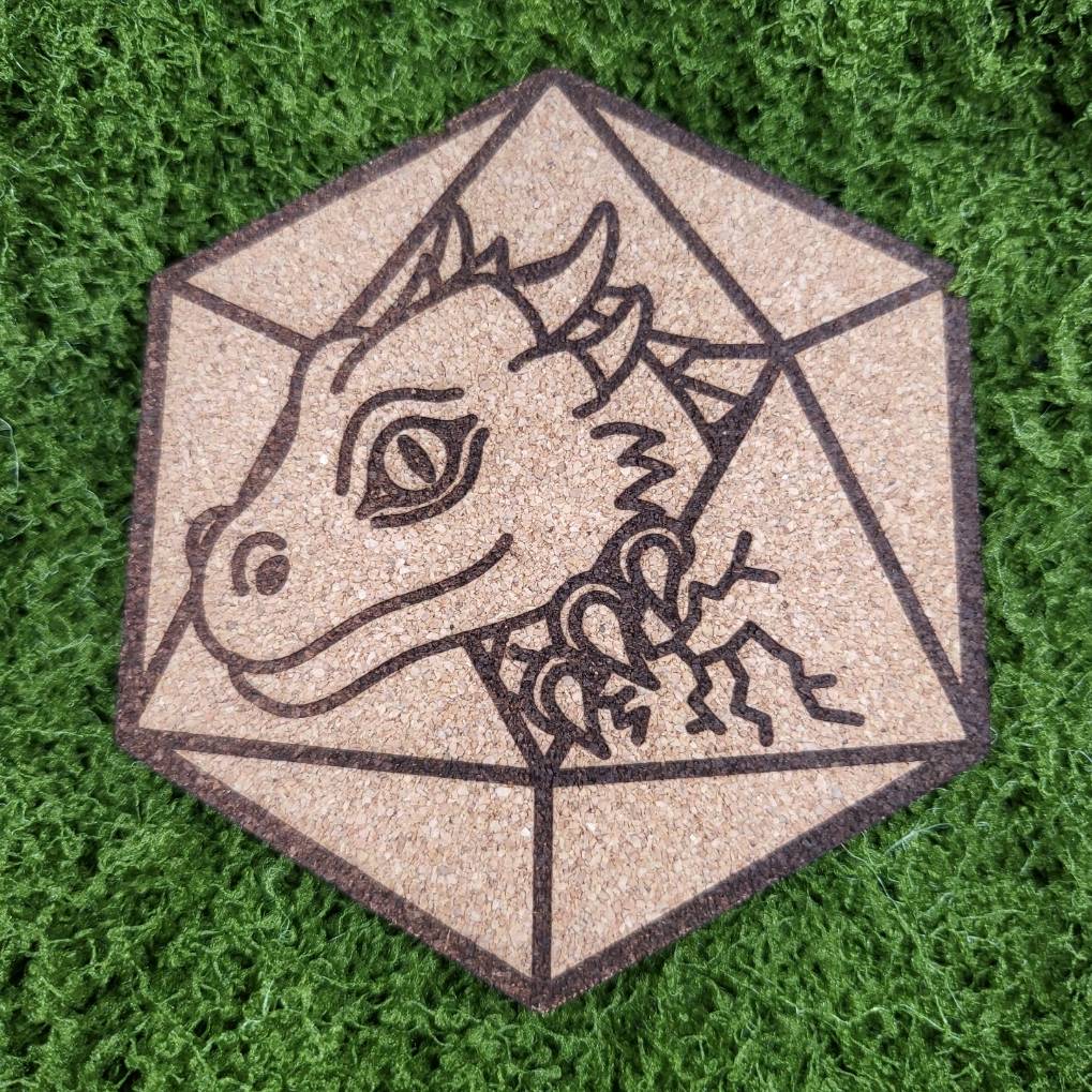 Korkový podtácek s vygravírovaným autorským motivem dráčka klubajícího se z dvacetistěnky, který by neměl chybět na stole žádného fanouška DnD a dračáků.