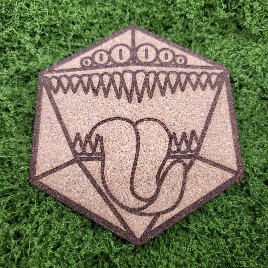 Korkový podtácek s vygravírovaným autorským motivem mimika v dvacetistěnce, který by neměl chybět na stole žádného fanouška DnD a dračáků.