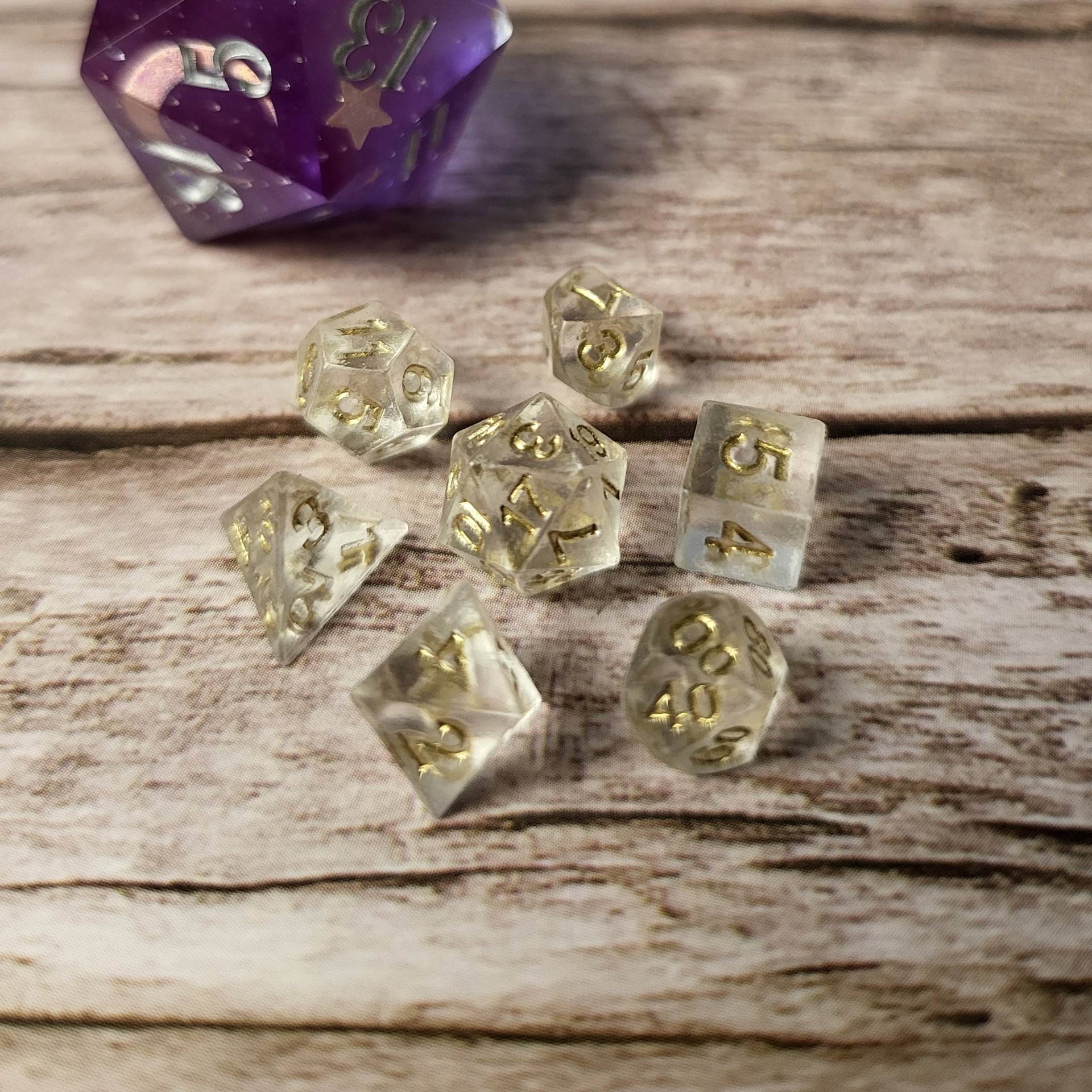 Sada sedmi miniaturních, ručně vyráběných kostek (d4, d6, d8, d10, d12, d20, d100) z pryskyřice.