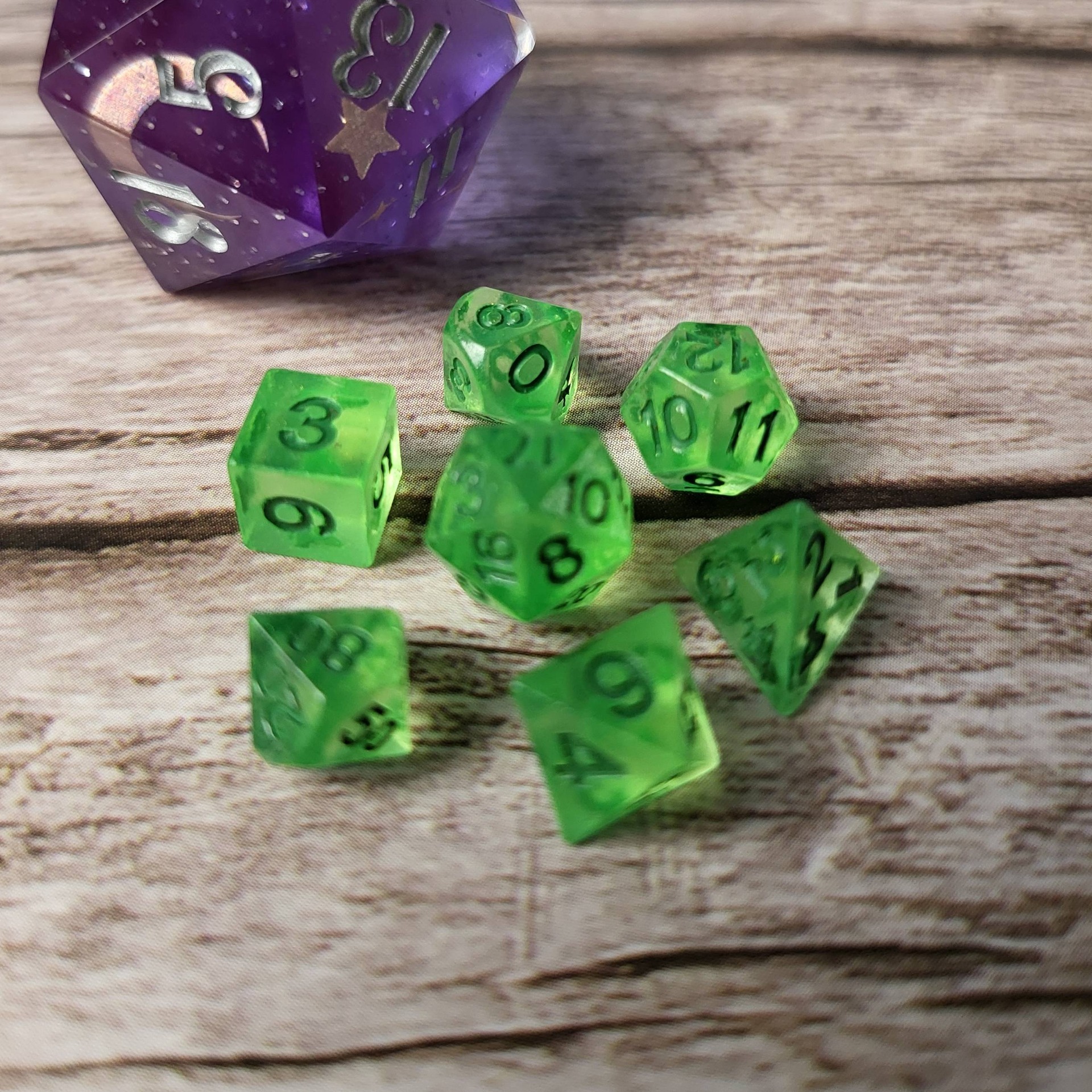 Sada sedmi miniaturních, ručně vyráběných kostek (d4, d6, d8, d10, d12, d20, d100) z pryskyřice.