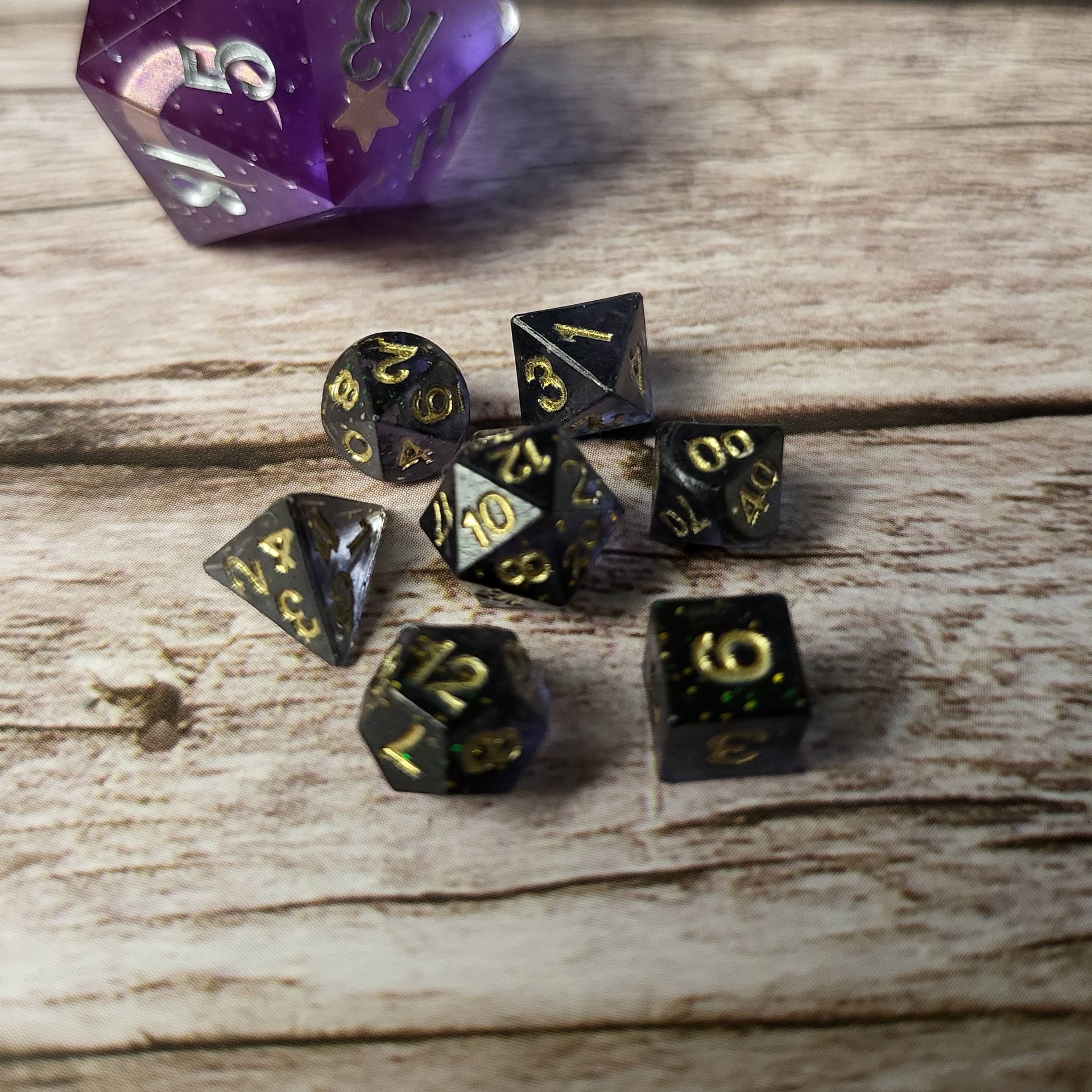Sada sedmi miniaturních, ručně vyráběných kostek (d4, d6, d8, d10, d12, d20, d100) z pryskyřice.