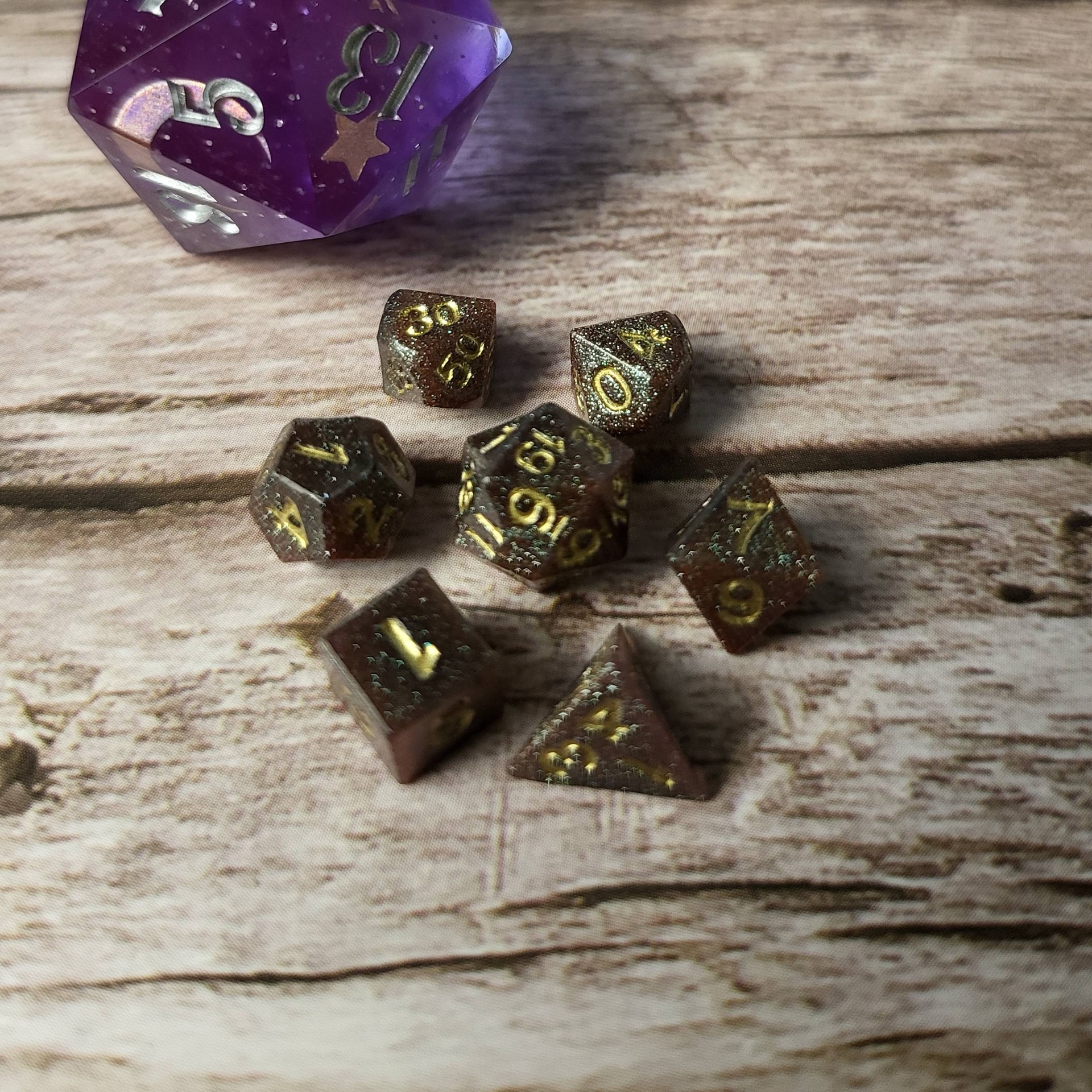Sada sedmi miniaturních, ručně vyráběných kostek (d4, d6, d8, d10, d12, d20, d100) z pryskyřice.