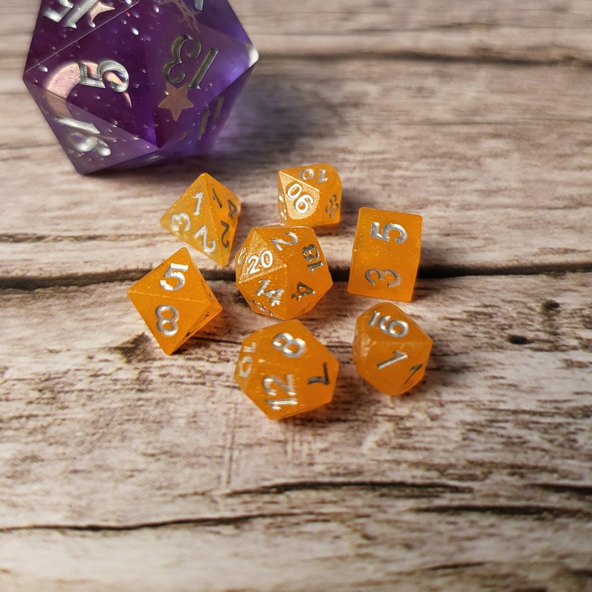Sada sedmi miniaturních, ručně vyráběných kostek (d4, d6, d8, d10, d12, d20, d100) z pryskyřice.