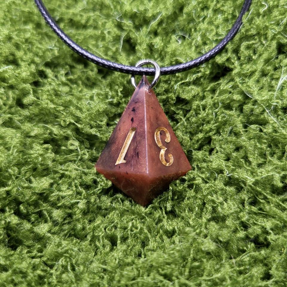 Ručně vyráběný náhrdelník s kostkou z pryskyřice (d4) – originální šperk pro milovníky DnD, RPG her a jedinečných doplňků. Každá kostka je unikát!