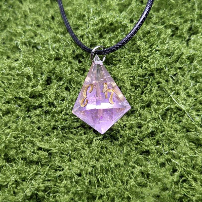 Ručně vyráběný náhrdelník s kostkou z pryskyřice (d4), která má uvnitř třpytivou fólii – originální šperk pro milovníky DnD, RPG her a jedinečných doplňků. Každá kostka je unikát!