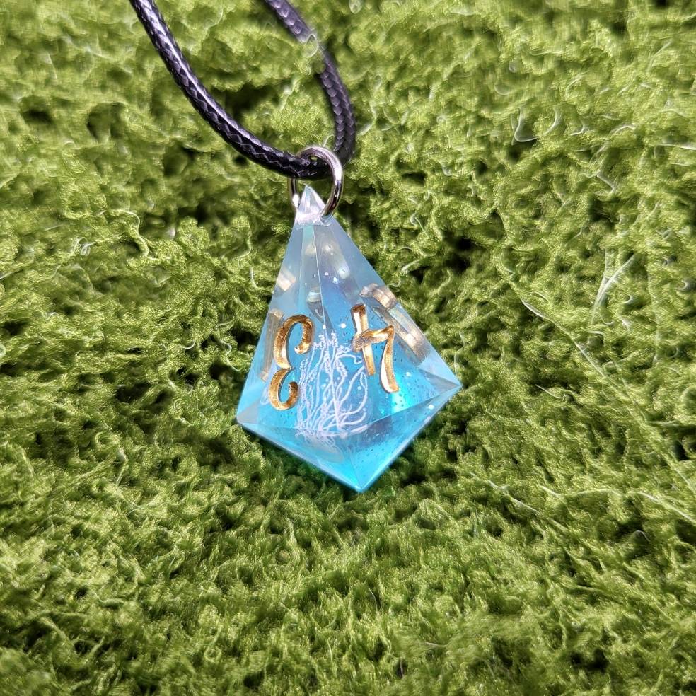 Ručně vyráběný náhrdelník s kostkou z pryskyřice (d4) se samolepkami medúz– originální šperk pro milovníky DnD, RPG her a jedinečných doplňků. Každá kostka je unikát!