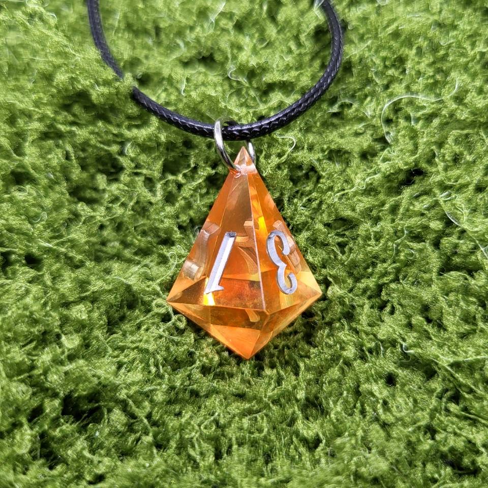 Ručně vyráběný náhrdelník s kostkou z pryskyřice (d4) – originální šperk pro milovníky DnD, RPG her a jedinečných doplňků. Každá kostka je unikát!