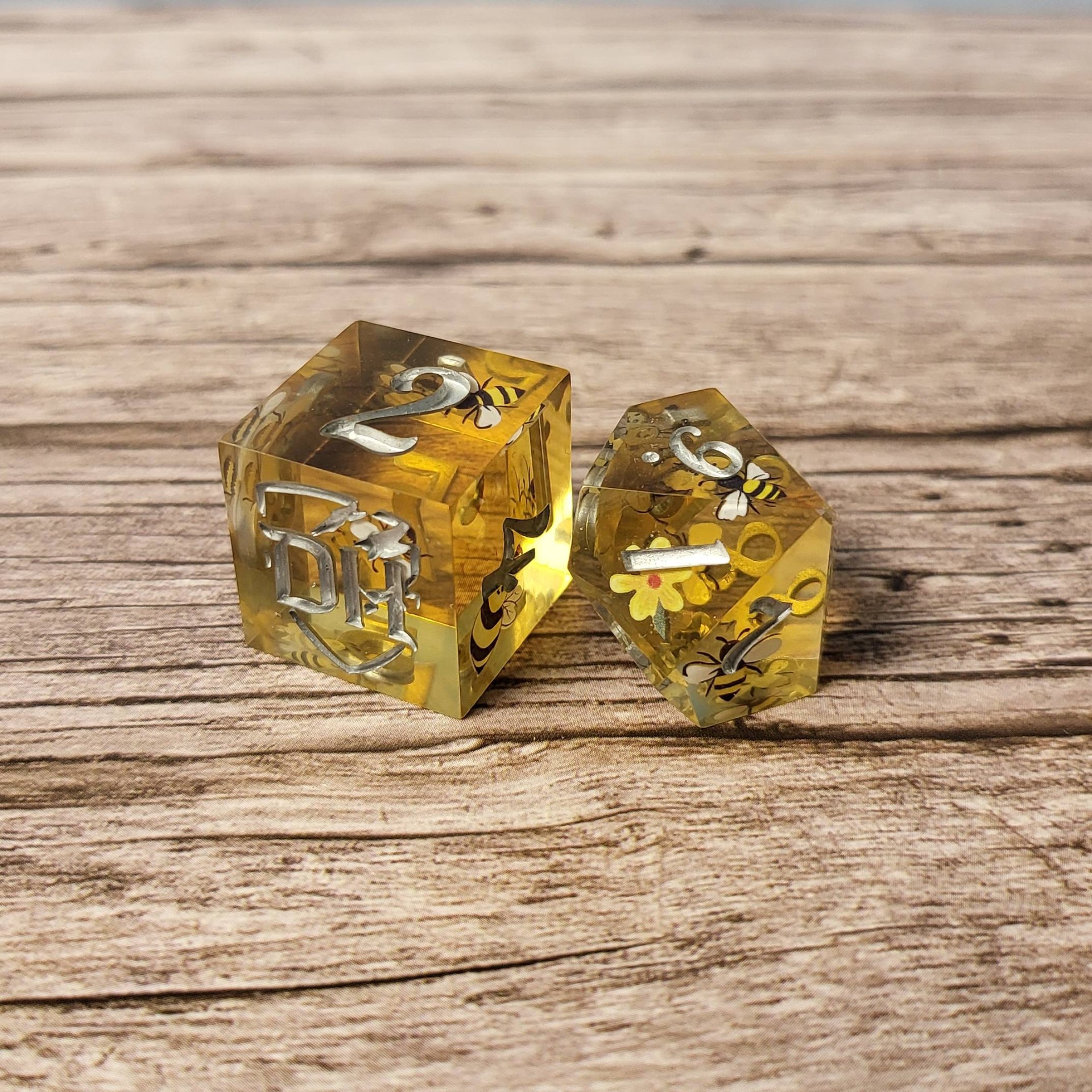 Sada kostek (d6 + d10) z pryskyřice s logem Dračí Hlídky a samolepkami včelek opylujících květy.