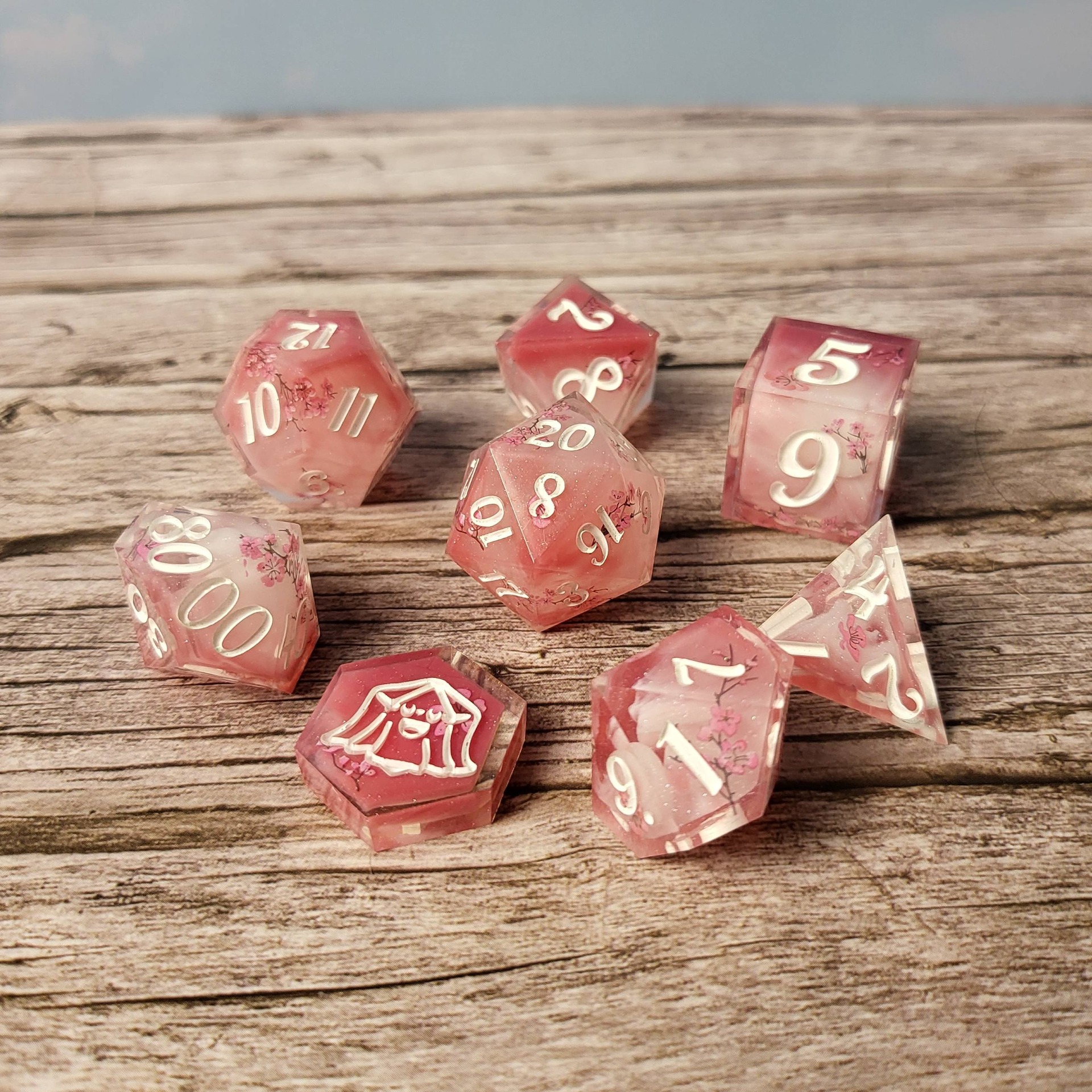 Sada osmi ručně vyráběných kostek (d2, d4, d6, d8, d10, d12, d20, d100) z pryskyřice se samolepkami květů sakury.