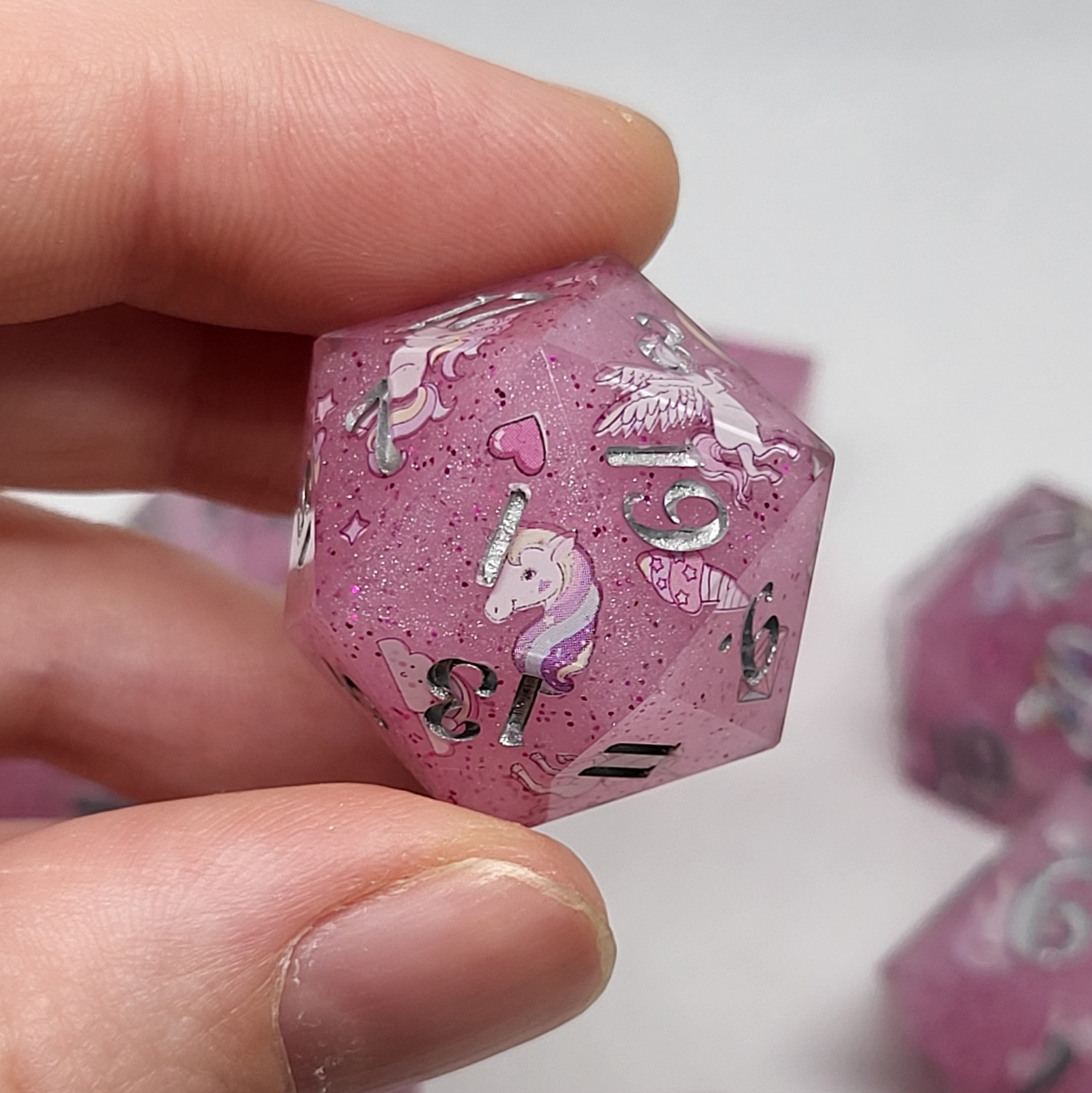 Sada osmi ručně vyráběných kostek (d2, d4, d6, d8, d10, d12, d20, d100) z pryskyřice se samolepkami s jednorožčí tematikou.